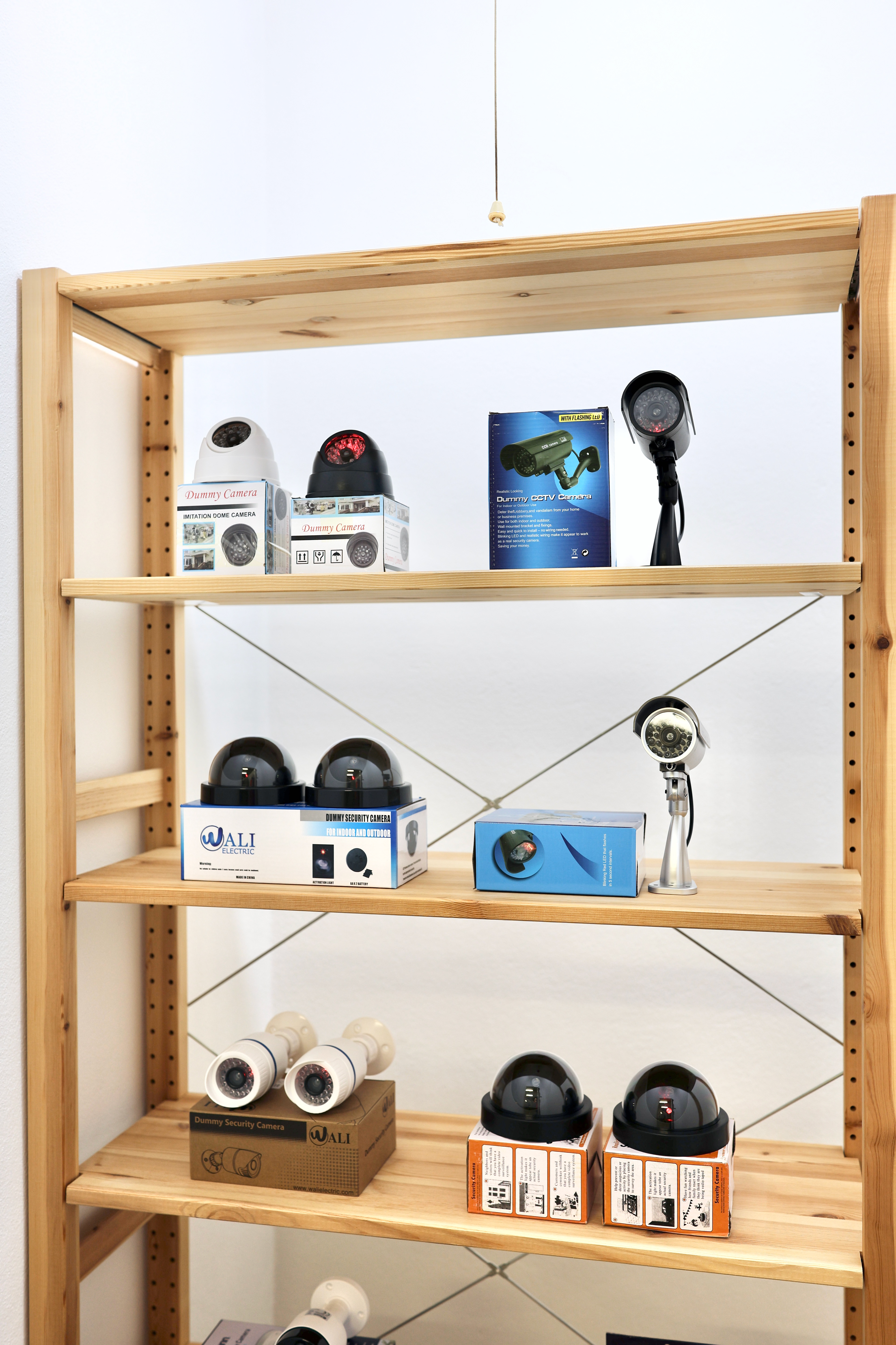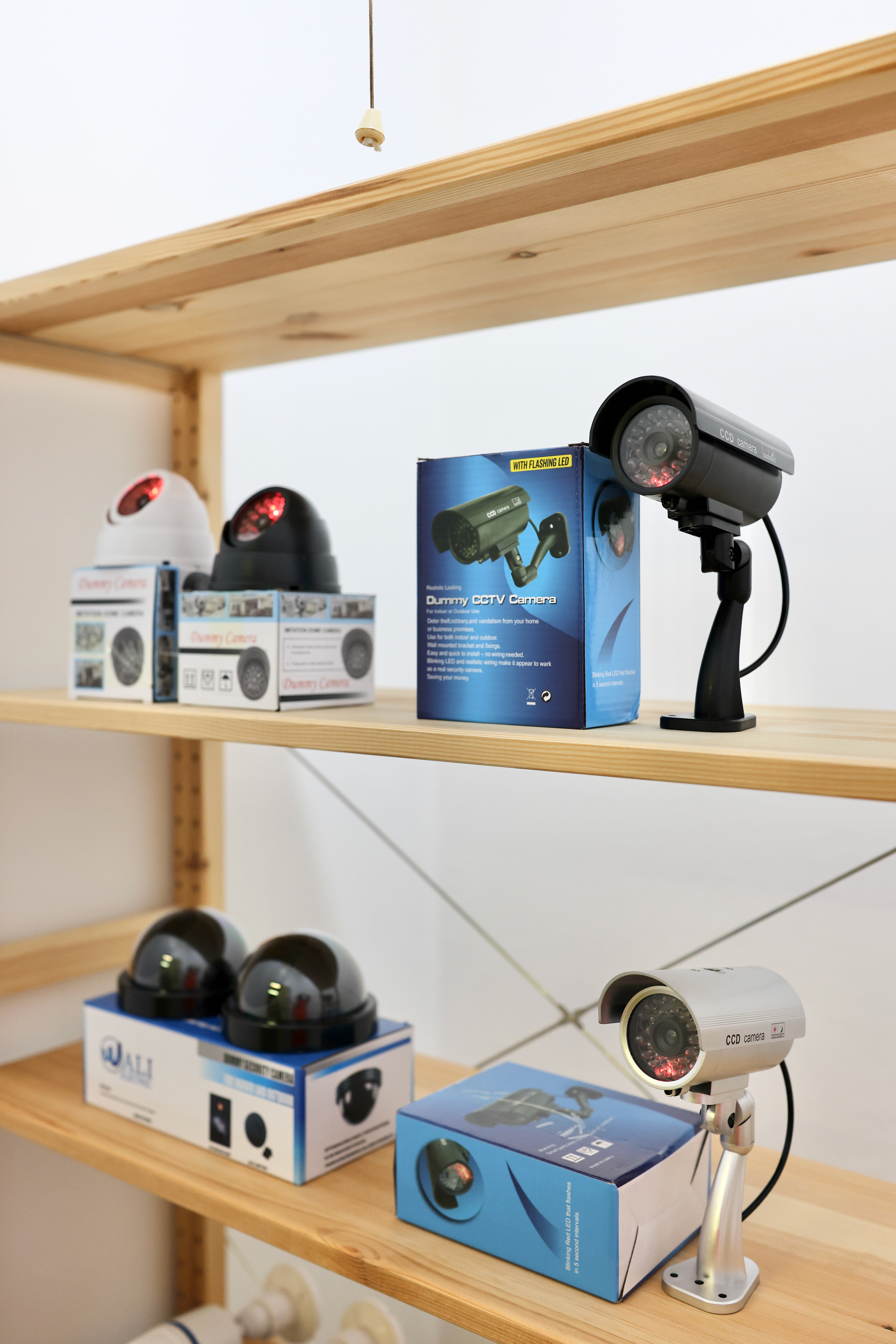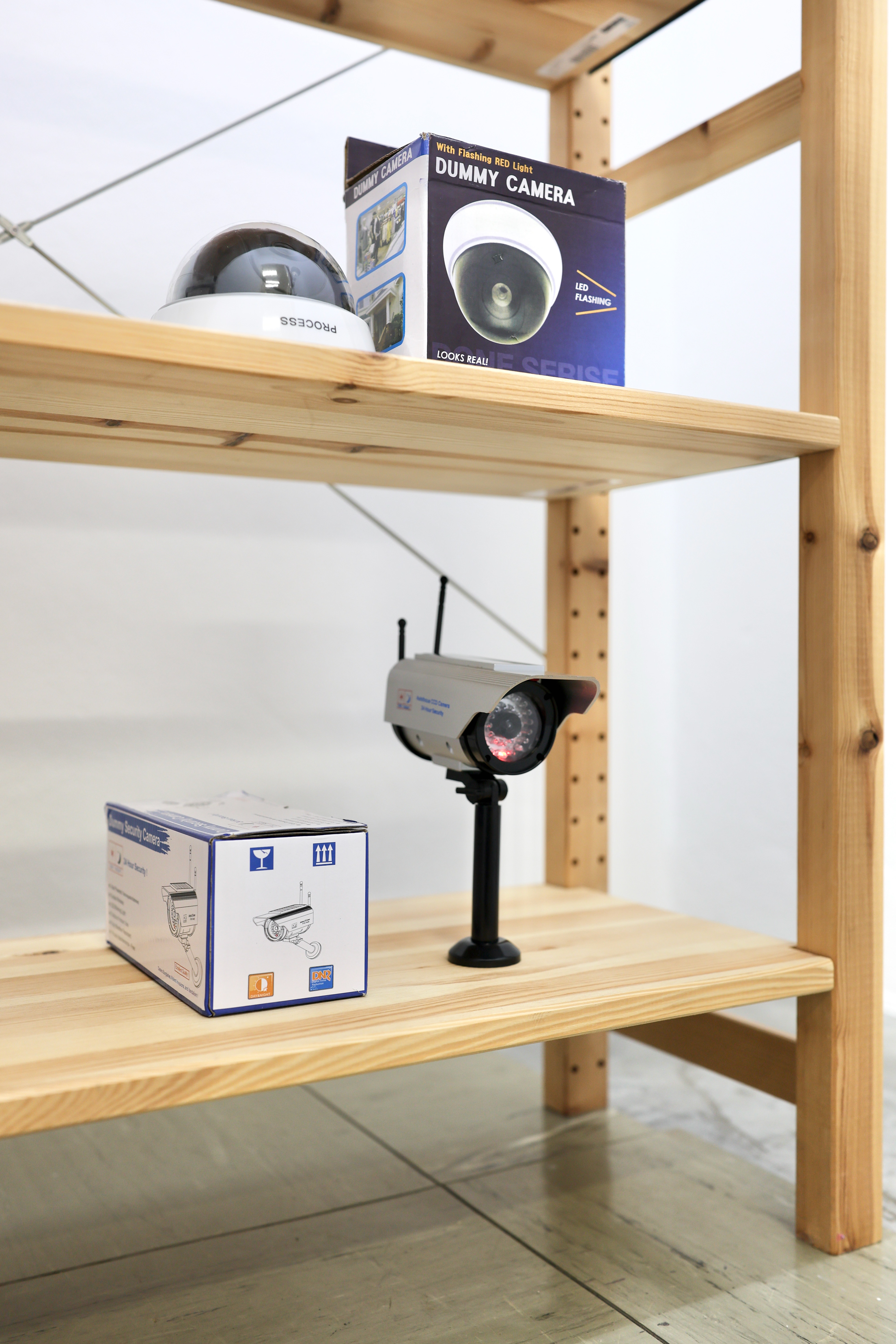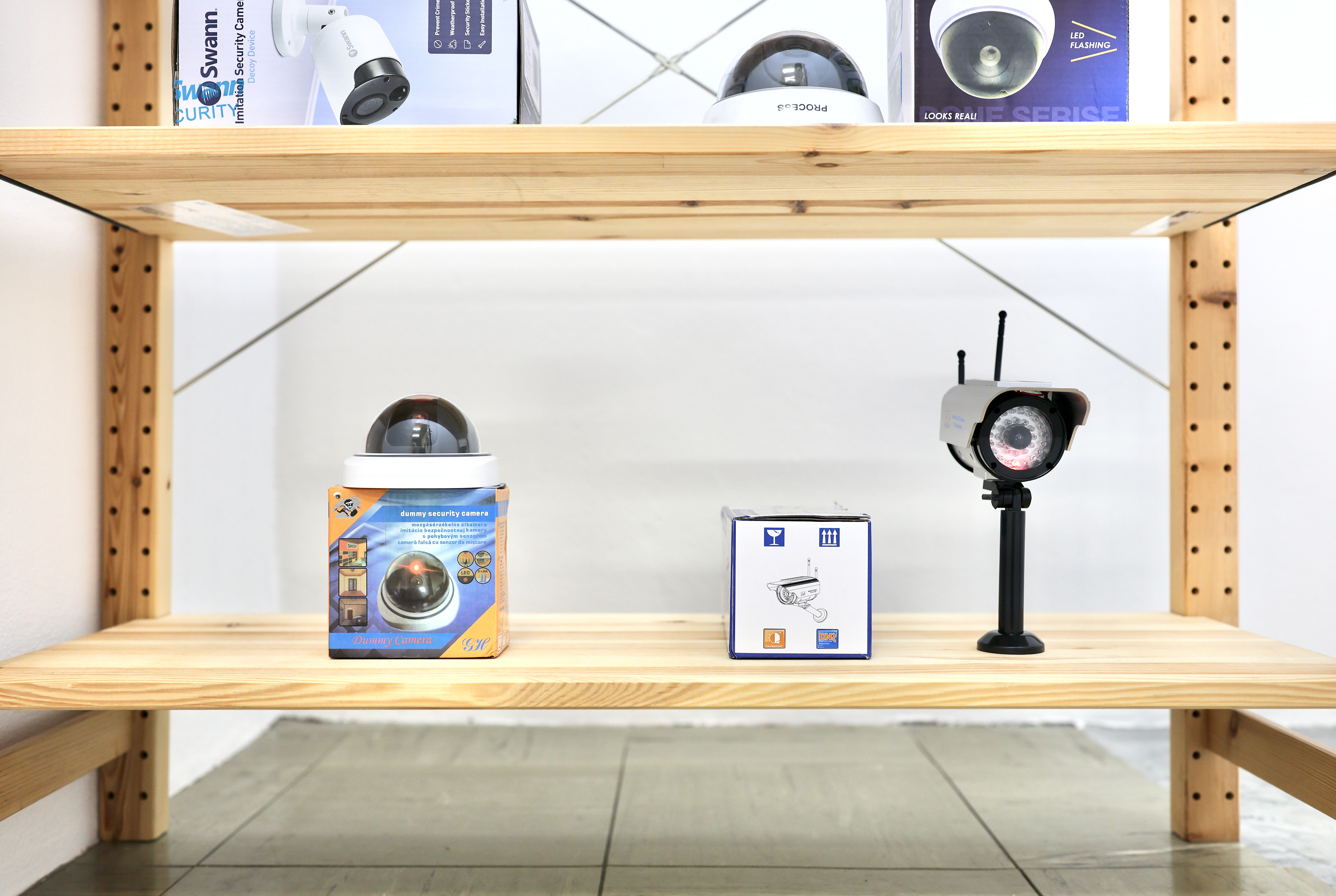 Dummy (2022) is a collection of mass-produced ‘dummy’ CCTV cameras which are presented along with their commercial packaging. The objects formally resemble real CCTV cameras but ultimately lack any optical functionality. With the addition of AA batteries, the stand-in camera devices display a sequence of red static or flashing lights, intended to imply the creation and storage of images. The cardboard packaging that accompanies each of the dummy cameras present instructions on use and installation, as well as texts describing the fake-ness, real-ness, and dummy-ness that these props propose to enact.