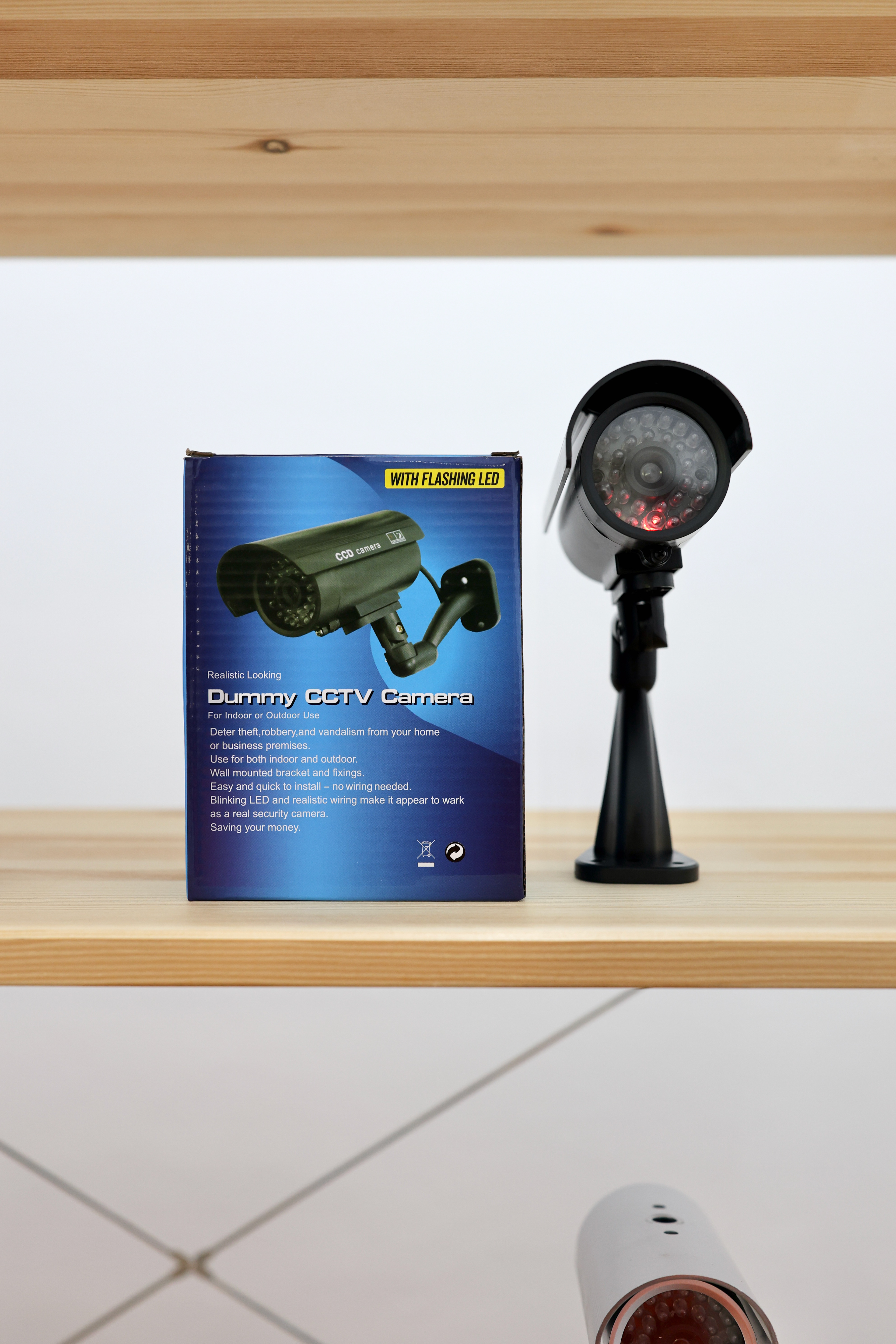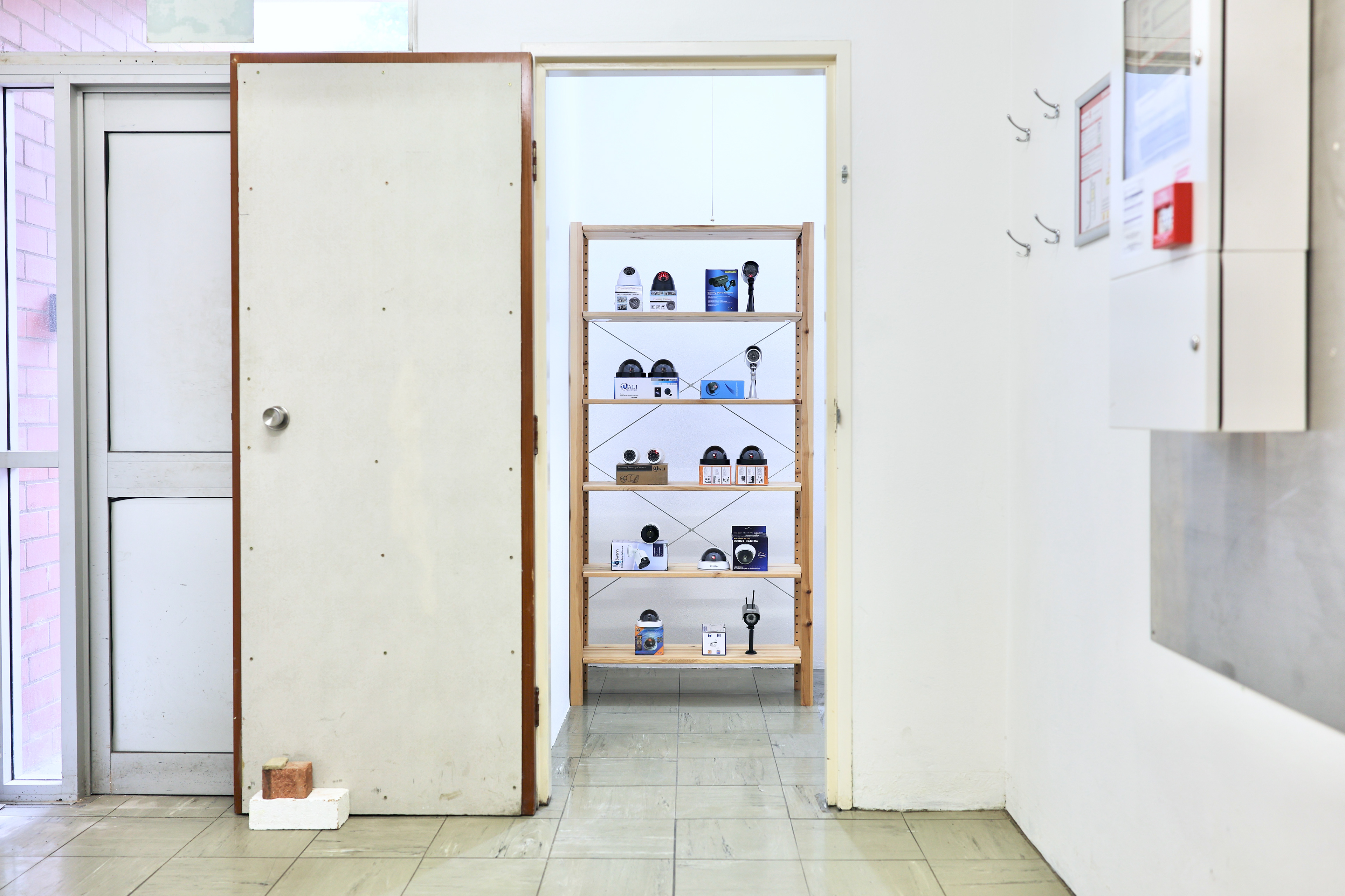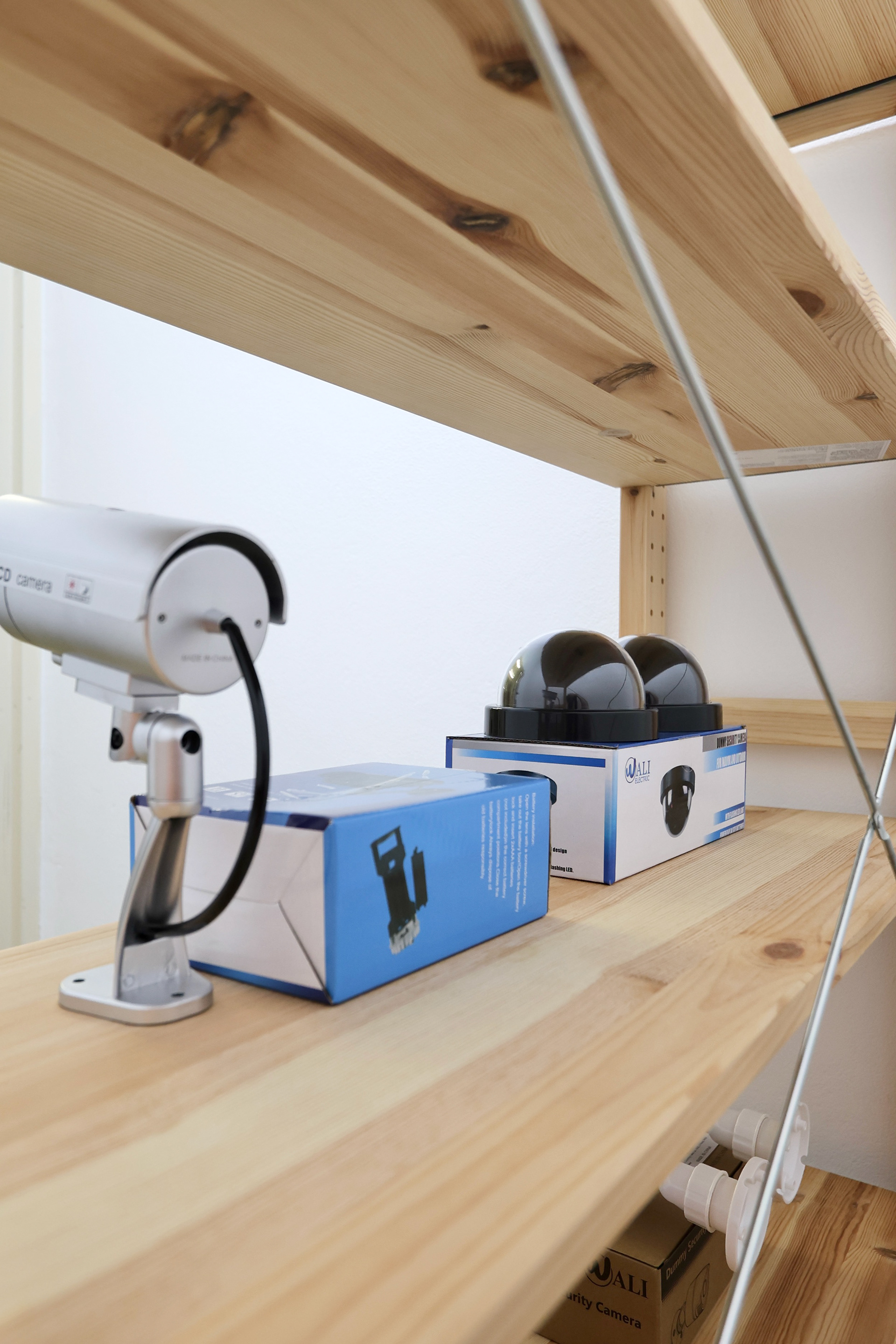 Dummy (2022) is a collection of mass-produced ‘dummy’ CCTV cameras which are presented along with their commercial packaging. The objects formally resemble real CCTV cameras but ultimately lack any optical functionality. With the addition of AA batteries, the stand-in camera devices display a sequence of red static or flashing lights, intended to imply the creation and storage of images. The cardboard packaging that accompanies each of the dummy cameras present instructions on use and installation, as well as texts describing the fake-ness, real-ness, and dummy-ness that these props propose to enact.