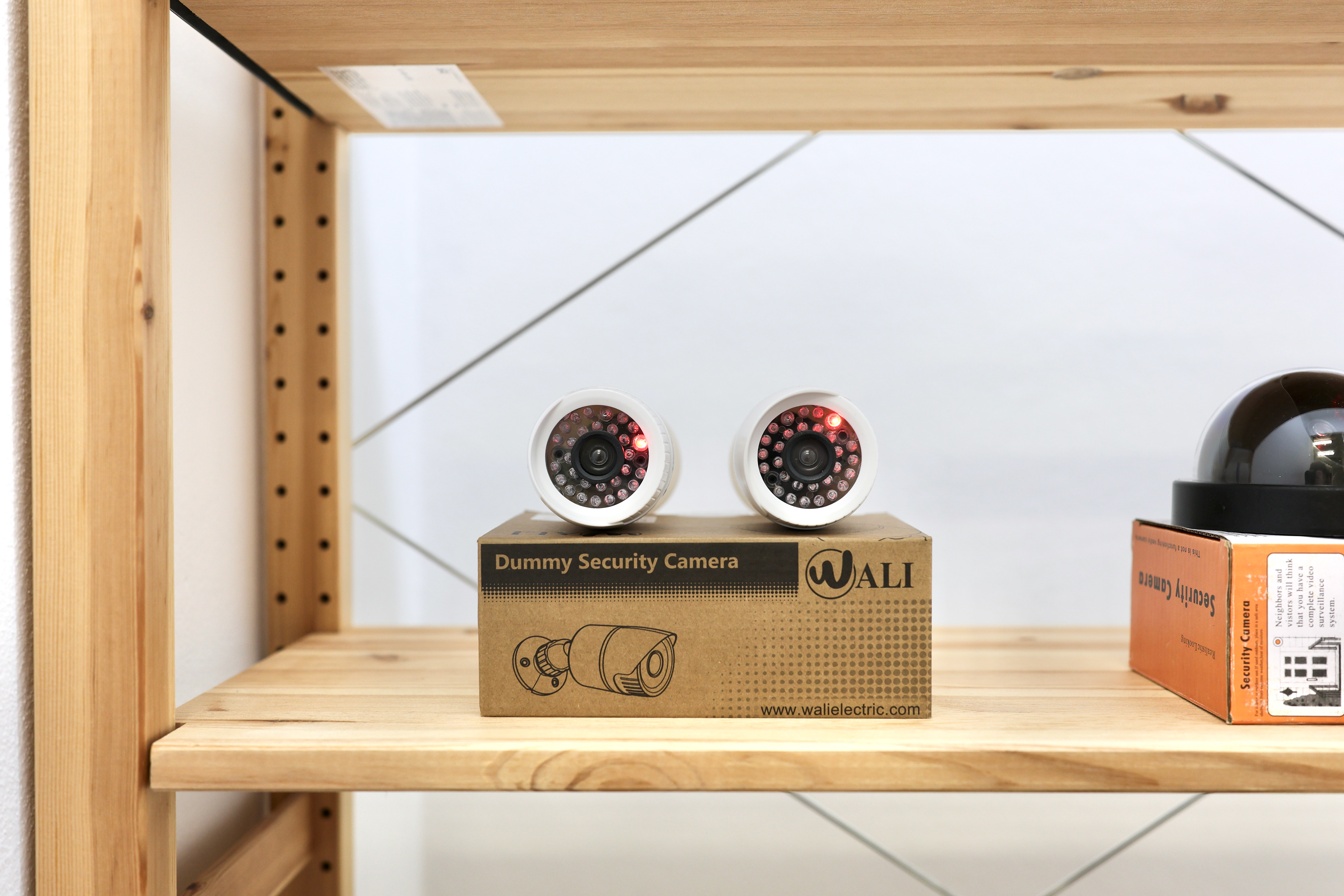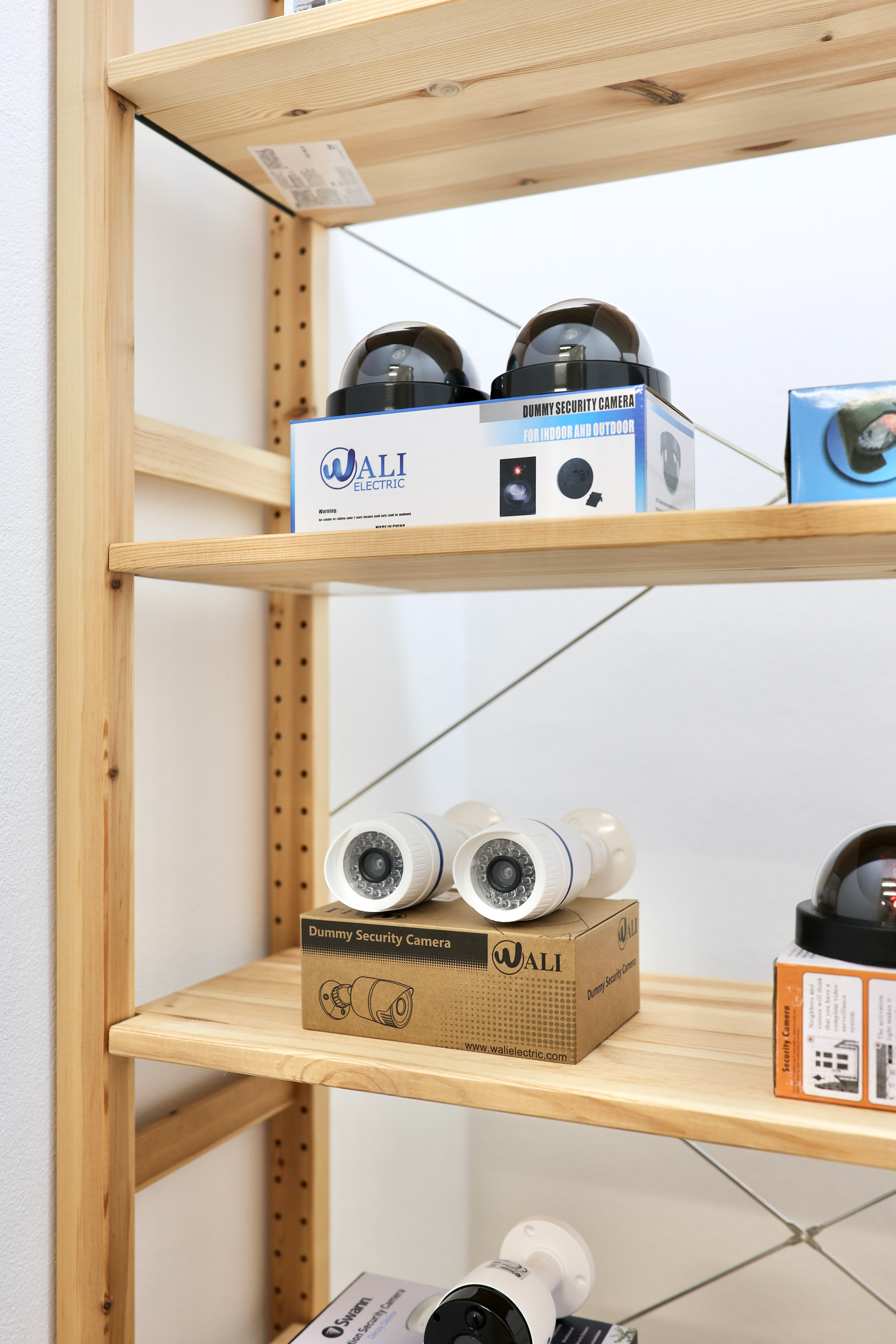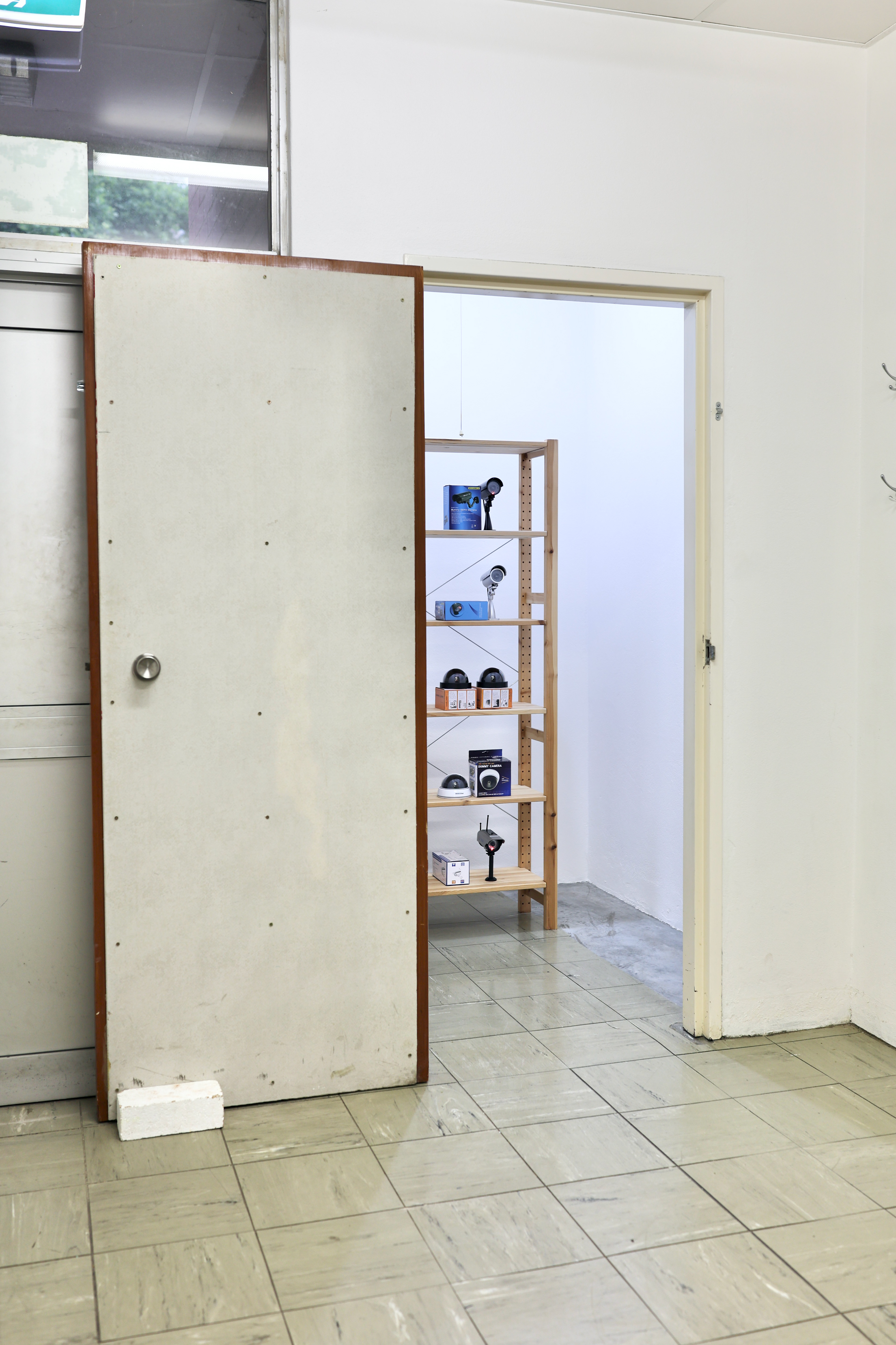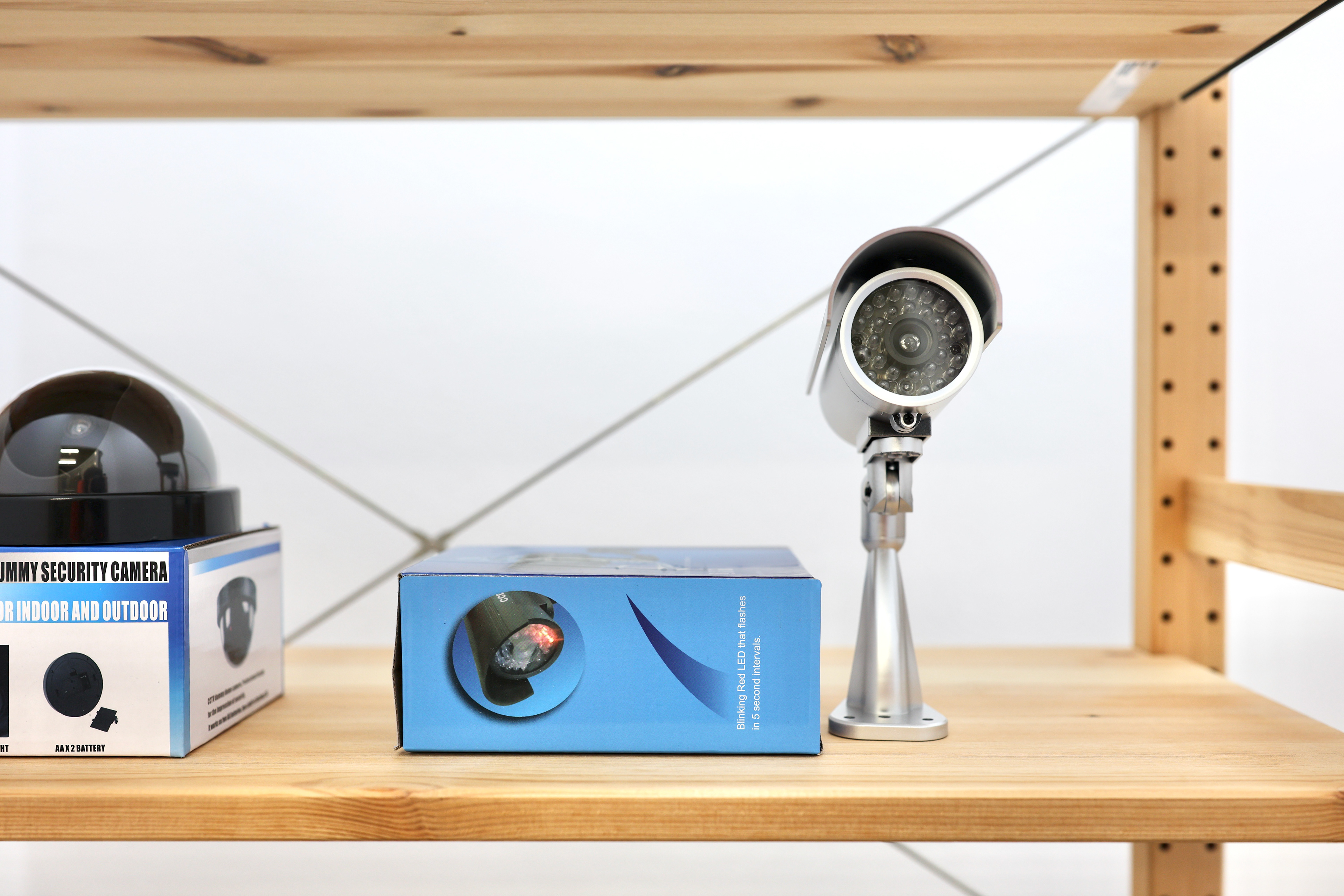 Dummy (2022) is a collection of mass-produced ‘dummy’ CCTV cameras which are presented along with their commercial packaging. The objects formally resemble real CCTV cameras but ultimately lack any optical functionality. With the addition of AA batteries, the stand-in camera devices display a sequence of red static or flashing lights, intended to imply the creation and storage of images. The cardboard packaging that accompanies each of the dummy cameras present instructions on use and installation, as well as texts describing the fake-ness, real-ness, and dummy-ness that these props propose to enact.