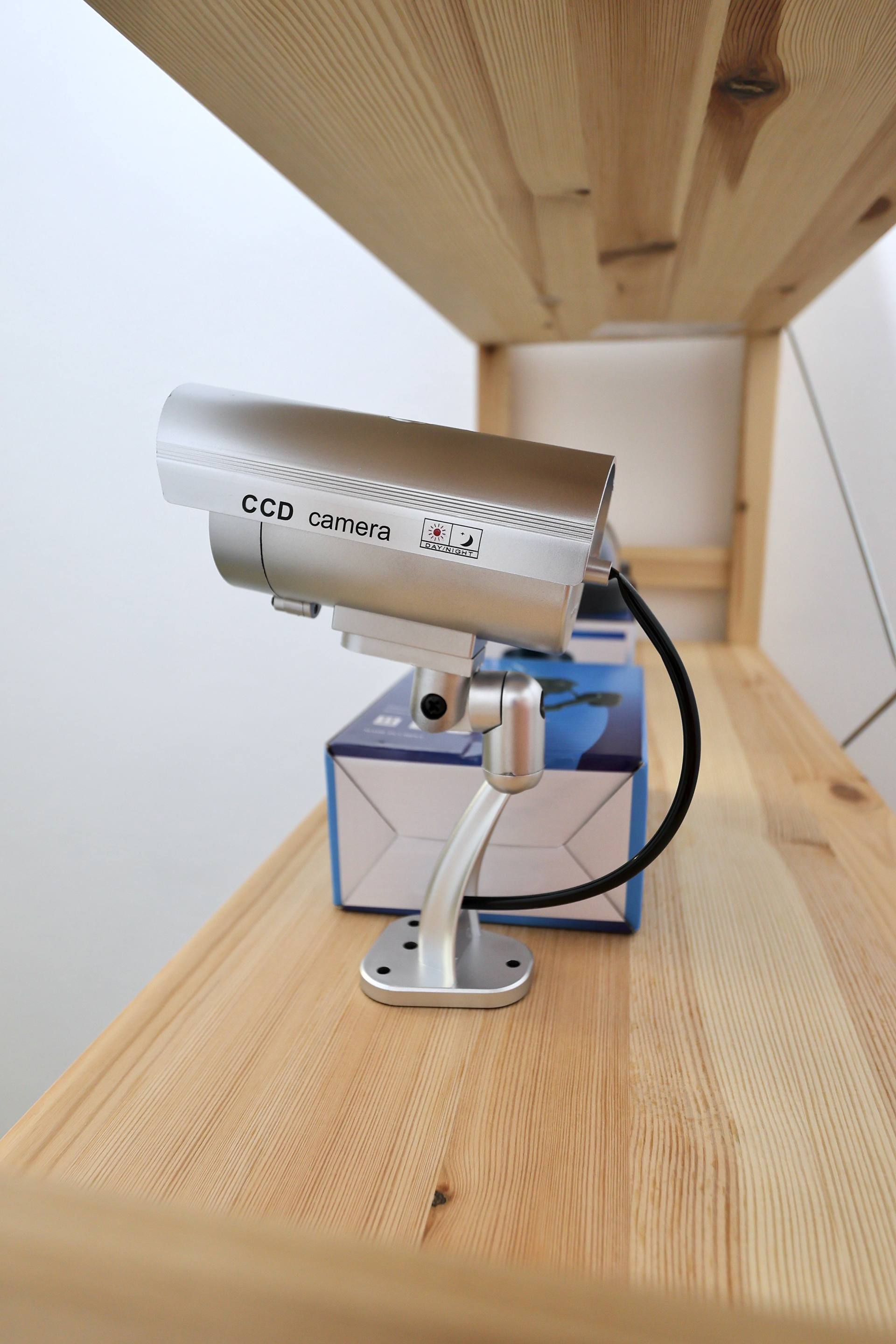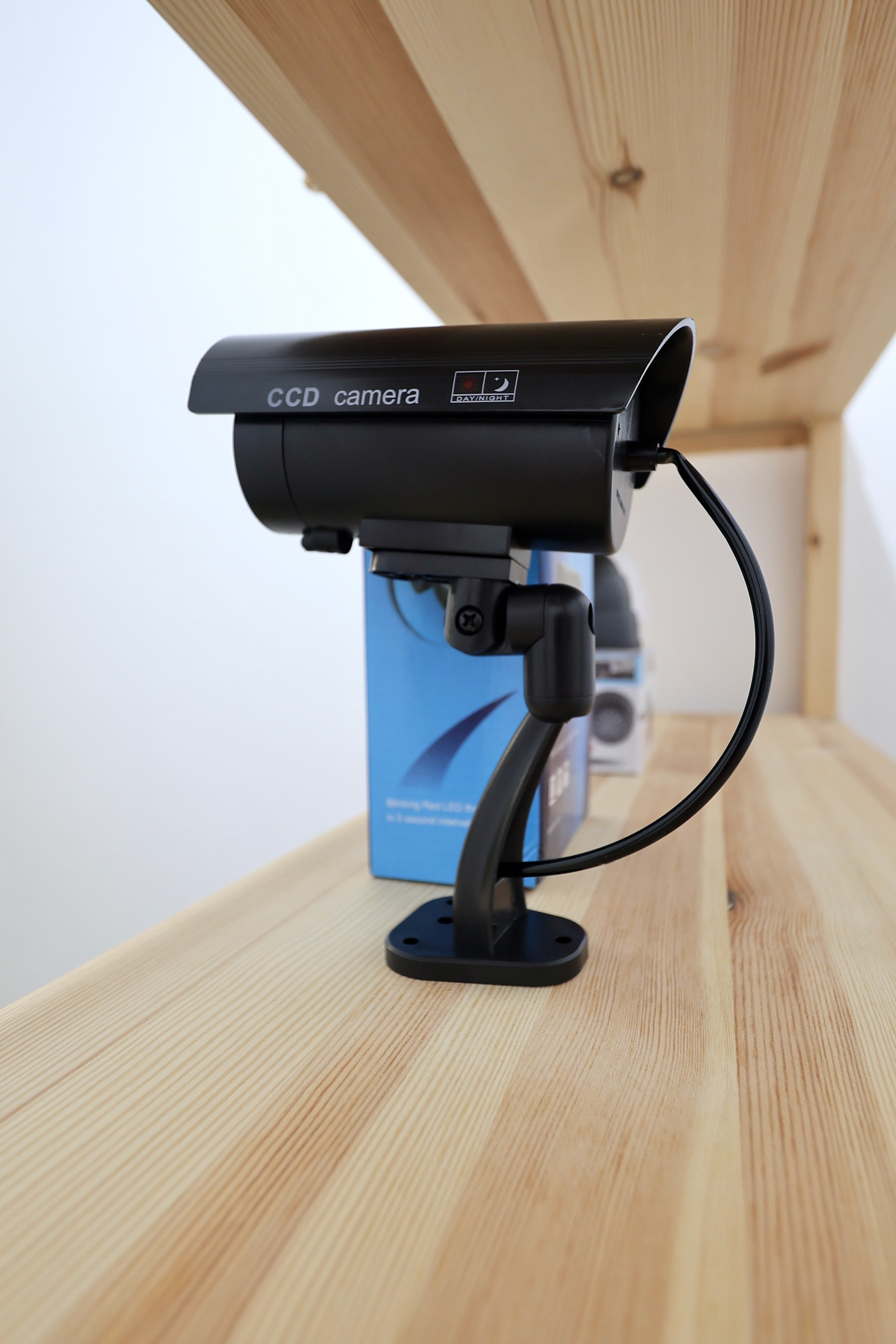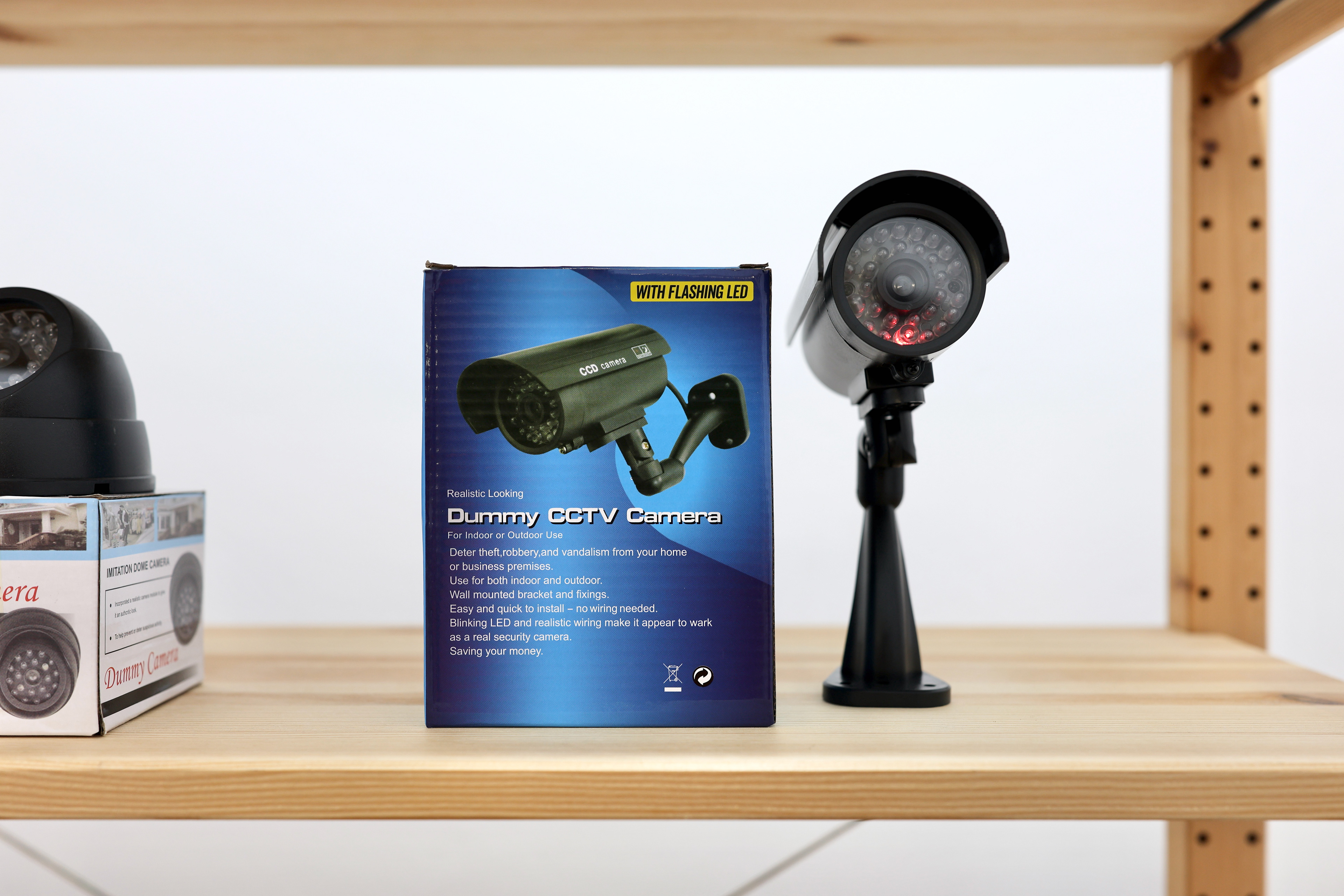 Battery-activated dummy CCTV cameras and their packaging